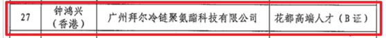 钟鸿兴董事是通过冷链产业学院共建单位拜尔冷链公司柔性引进的花都区高层次人才,兼任广东省冷链标准化工程技术研究中心副主任,已于2021年7月,被相关主管部门认定为“广东省港澳台高层次人才”。