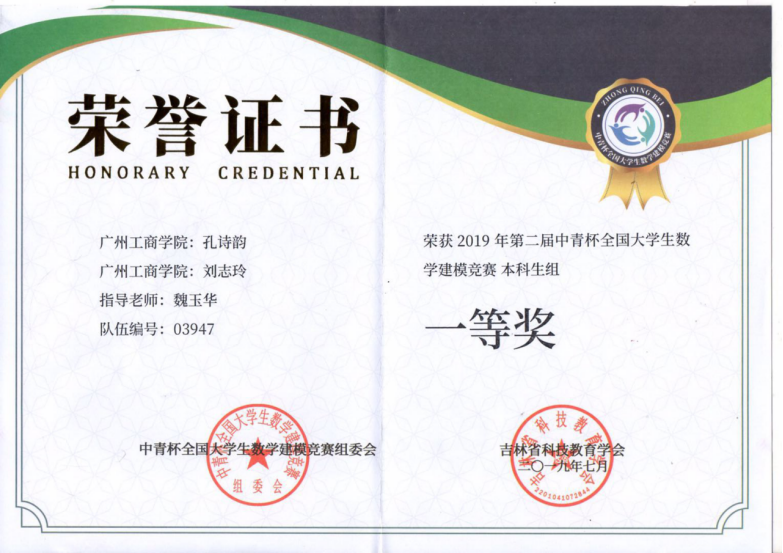 【本网讯】近日,2019年“中青杯”全国大学生数学建模竞赛获奖名单揭晓,我院孔诗韵、刘志玲两位同学在指导教师魏玉华的带领下荣获本科生组一等奖。为了鼓励师生,学院给予获奖学生5000元、指导教师2000元的奖励。